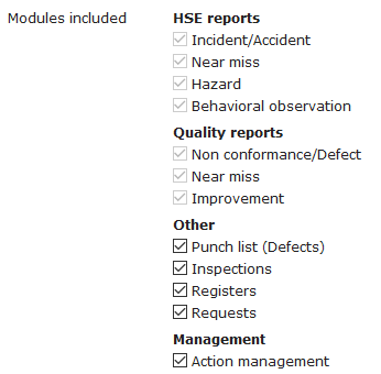 Add modules that you required. Default option include all HSEQ modules and then you can add Inspections, Requests, Defect Management (Punch Lists), Registers & Action Management. We are adding new modules all the time so please check your subscription regularly.