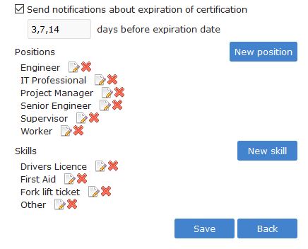 At the top is a tick box - the numbers separated by a comma indicates the frequency of notifications to be sent to the administrator and/or employee for when a certain notification is about to expire. In this case and email will be sent at 14 days before expiry, 7 days and then again 3 days.