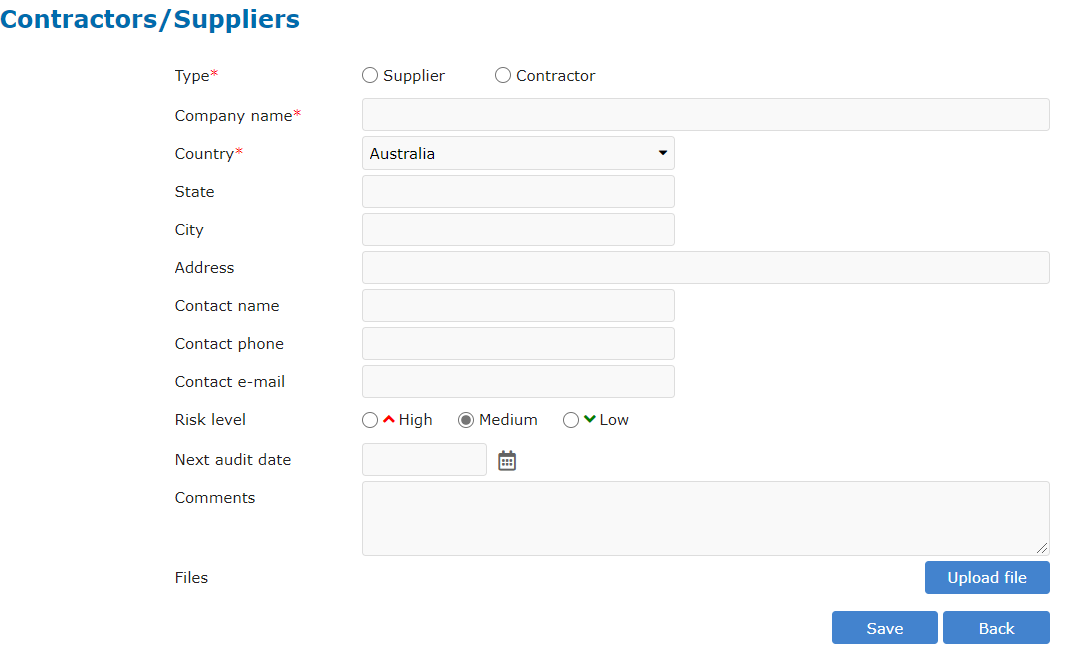 Contractors & Suppliers module is to provide the company with a single location or register for all suppliers and contractors working for your organisation. Supplier or contractor detail is required to be filled in: