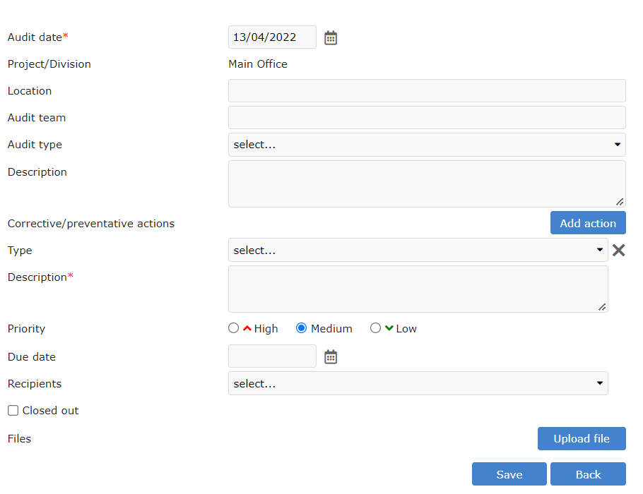 Simply click on the 'Add action' button and add an action. Enter a description of the action, set the priority, due date. Then select the recipients (persons responsible to close out the action.