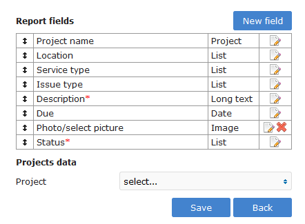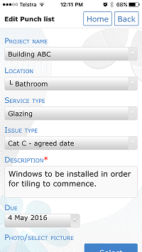 - Fill in the report. Remember to capture as much detail as possible. Project, Location, Service type, Issue type, Description, Due date, Photos, Status, Recipients.