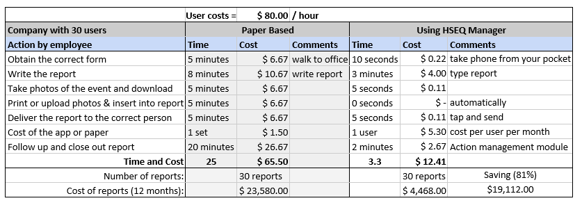 Using an average cost of $80/hour for a worker and applied to each step in the process of creating a new report. We compare the two methods over a period of 12 months. In this time the user created 30 reports which shows the time spent using the paper based system and the HSEQ Managers application.